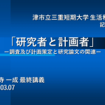 2026年3月7日、小野寺先生の最終講義「研究者と計画者―調査及び計画策定と研究論文の関連」を開催しました。卒業生や在校生、三重県や津市の職員の方々、また市民の方々など120名を超えるみなさまにお越しいただきました。小野寺先生のご専門は都市計画、住環境整備で、『コンパクトシティの拠点づくり』や『地方都市の再生計画』をテーマに、津市や四日市市など、三重県内の地域課題に深く切り込んだ研究を精力的に発表されてきました。先生の研究や教育にかける熱い思いを感じることのできる心に残る最終講義でした。小野寺先生は2014年に本学へ着任され、多くの学生の教育、育成に多大なるご尽力を賜りました。深く感謝申し上げます。ご退官後も変わらぬご指導を賜れば幸いです。何よりご健康で、ますますご活躍されますことを心よりお祈り申し上げます。